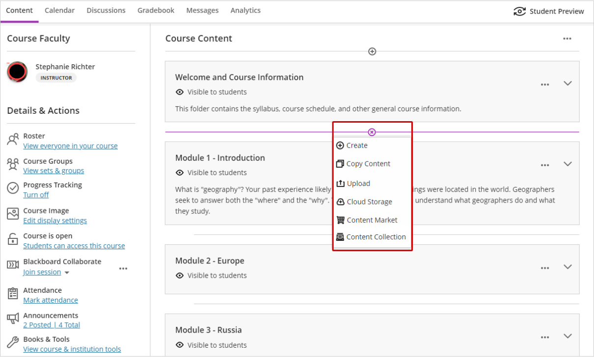 Quickly add files, links, assignments, and other content and assessments wherever you want! Learn more about creating content in Blackboard Ultra
