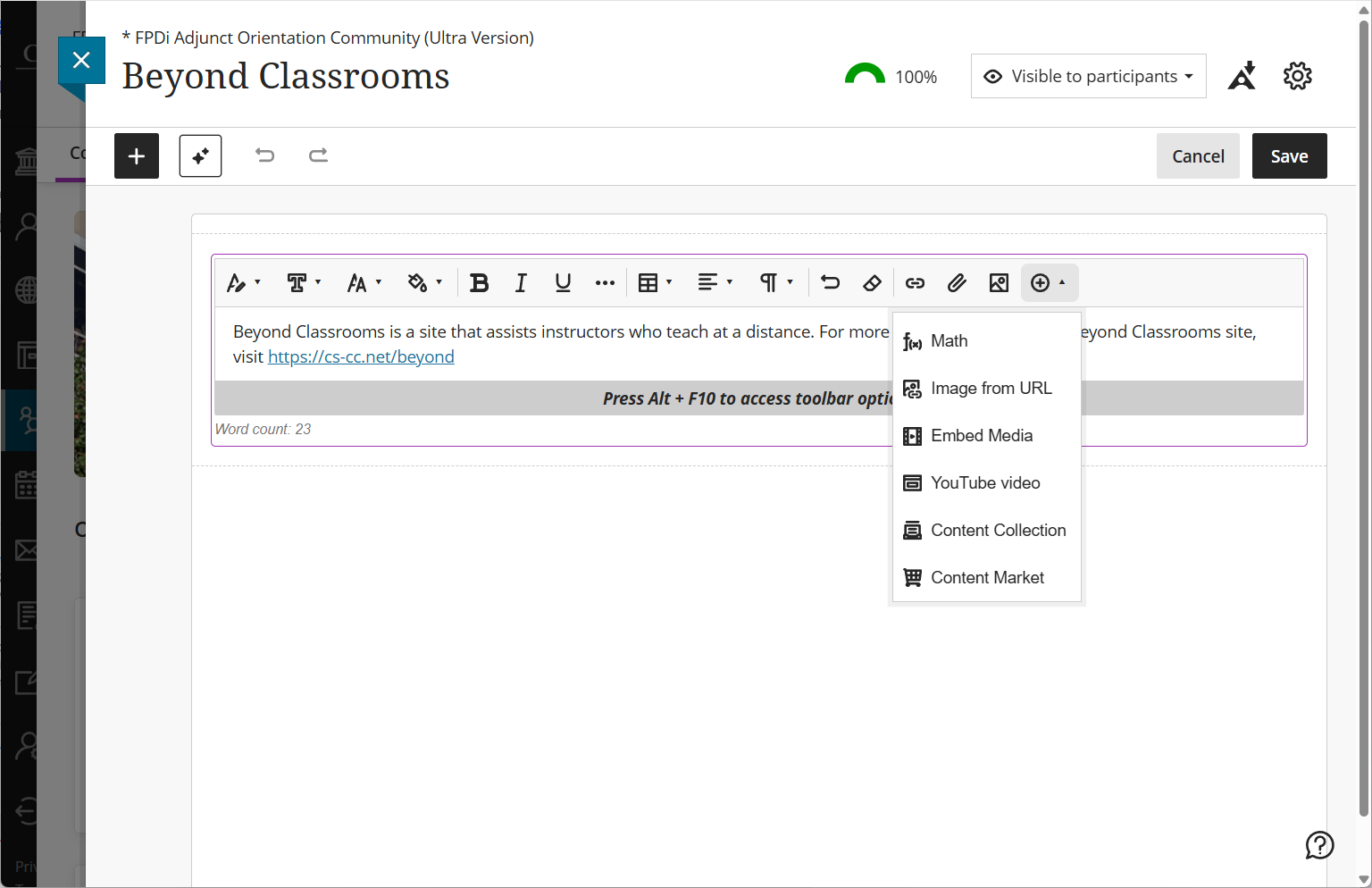 The brand-new text editor in the Ultra Course View is optimized to create content that is mobile-compatible, so that you and your students can access it directly from a smartphone browser. The text editor is simplified, but includes tools for formatting text, adding links and media, and embedding mathematical and scientific formulas in your text. Learn more about the new text editor.