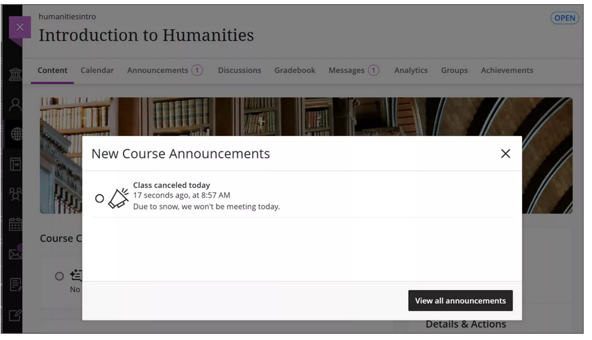 In the Ultra Course View, in addition to having announcements sent to students via email, they also appear in the Activity Stream along with other course updates. Additionally, they now in Ultra Course View also appear as pop-ups for each student the next time they enter the course. Learn more about Announcements.