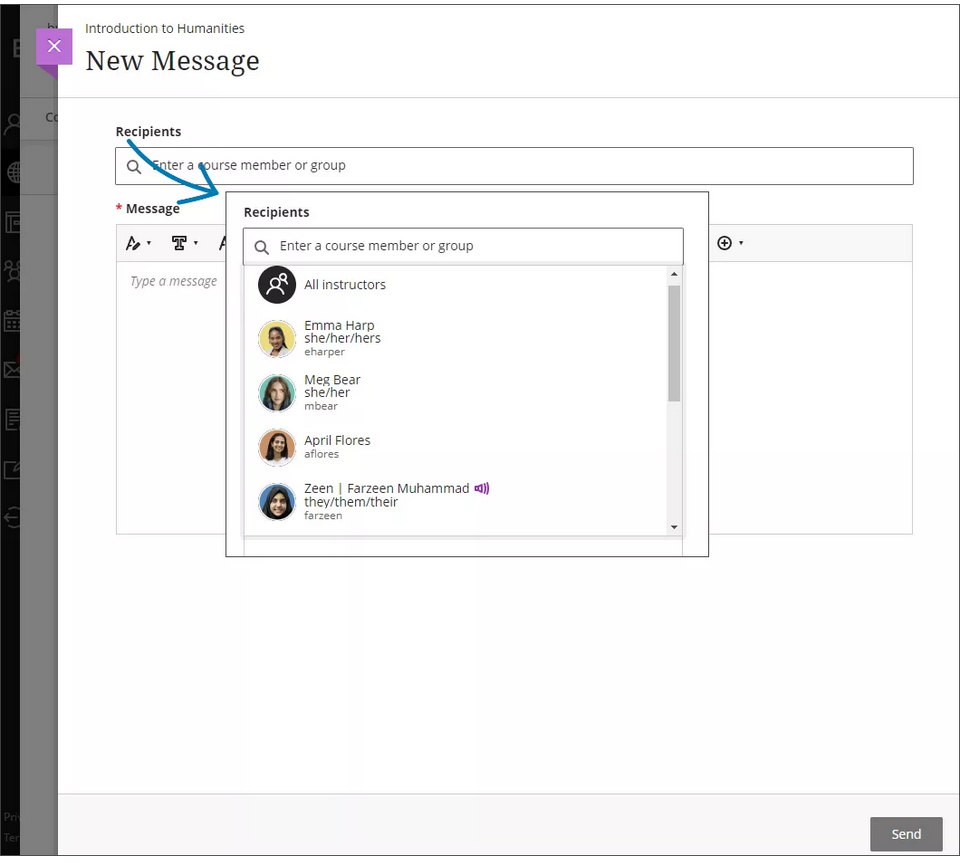 The Ultra Course View does not include the Send Email function that you may be used to in the Original Course View. Instead, send Messages. You and your students can send messages to each other, multiple people, or the entire class. Unlike sending an email in Original Course View, the Messages are kept in the system and can also be sent via email. Learn more about Messages.